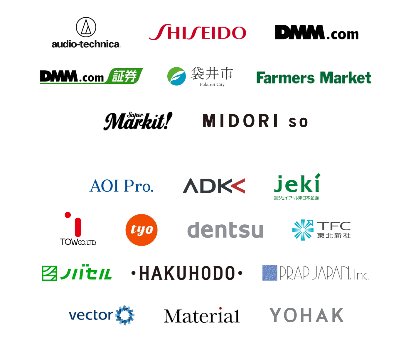 | 主要取引先 | / 株式会社 AOI Pro. / 株式会社 IRIS / 株式会社 エース・マーチャンダイズ / 株式会社 ADKホールディングス / Oasys PTE. LTD. / 株式会社ジェイアール東日本企画 / double jump.tokyo株式会社 / 合同会社 DMM.com / 株式会社 DMM.com証券 / 株式会社 電通 / 株式会社 ティー・ワイ・オー / 株式会社 テー・オー・ダブリュー / 株式会社 博報堂 / プランニングメイ 有限会社 / 株式会社ニューステクノロジー / ポケット 株式会社 / 株式会社 マテリアル / 合同会社 ヨハク / 他(五十音順) |
